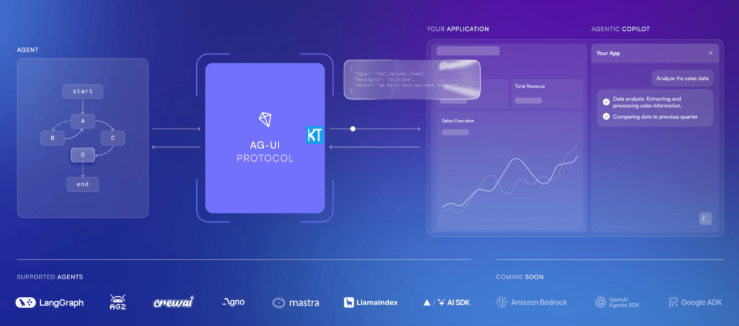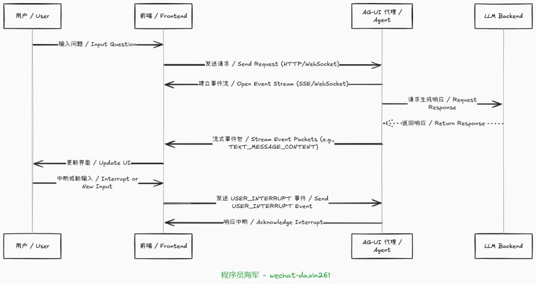 正是在这样的背景下,2025年5月,以开发AI集成工具包CopilotKit而闻名的技术团队,正式开源发布了AG-UI (Agent-User Interaction Protocol)。其核心使命直击痛点:为AI智能体(Agent)与用户界面(UI Application)之间的实时、双向、结构化通信,制定一个专门为智能体与用户交互而设计的开放标准。