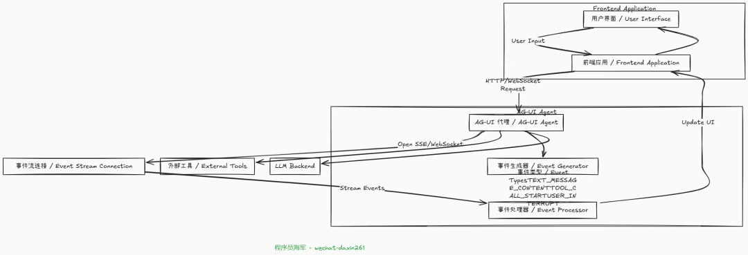AG-UI协议,全称Agent-User Interaction Protocol(智能体用户交互协议),是一个轻量级、事件驱动的开放协议。它充当了后端AI智能体和全栈应用之间的桥梁,是智能体与用户相遇的地方。