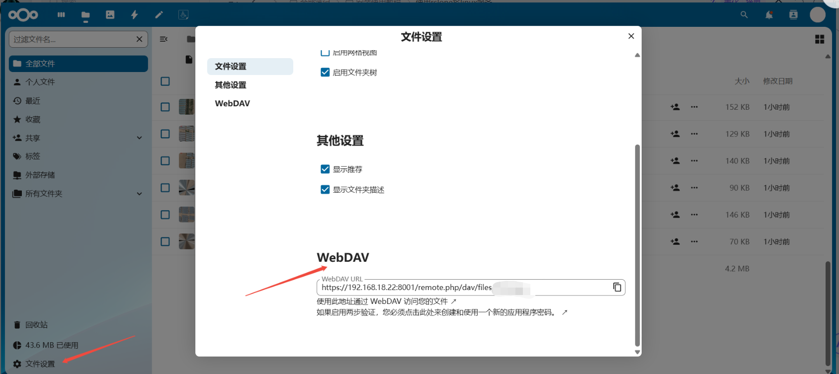 登录nextcloud网页,点击文件设置,寻找WebDav URL