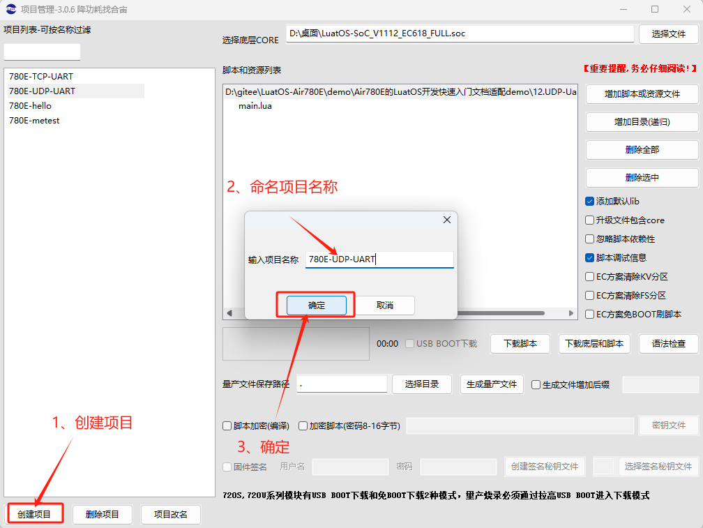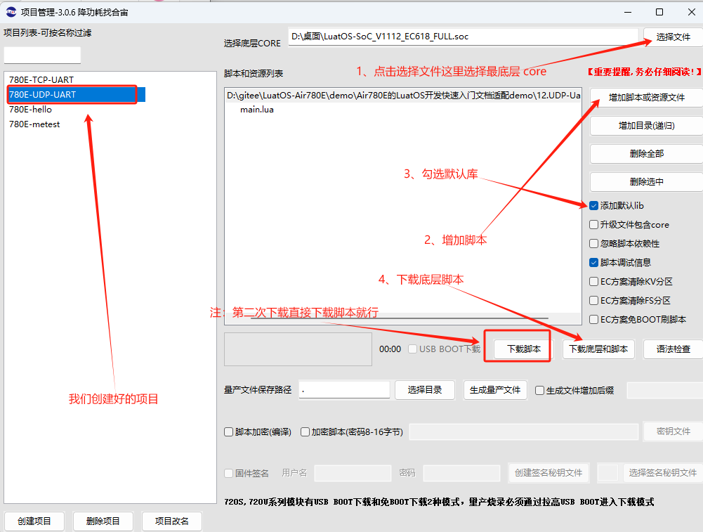 选择780E板子对应的底层core和刚改的main.lua脚本文件。下载到板子中。