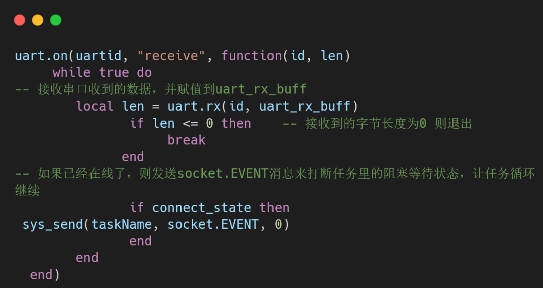 这里使用uart.rx接口,和以zbuff的方式存储从uart1外部串口收到的数据--收取数据会触发回调,这里的"receive"是固定值不要修改。