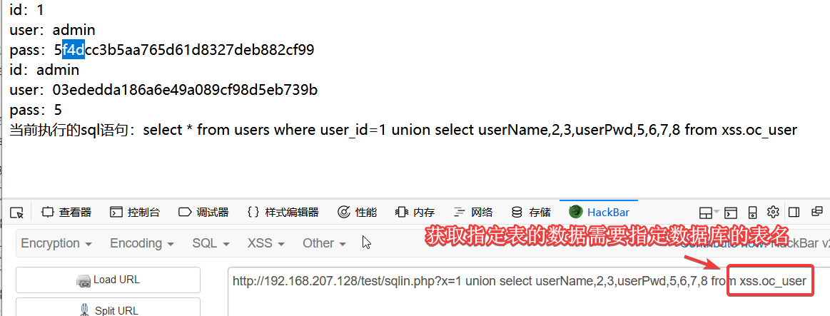 http://192.168.207.128/test/sqlin.php?x=1 union select userName,2,3,userPwd,5,6,7,8 from xss.oc_user