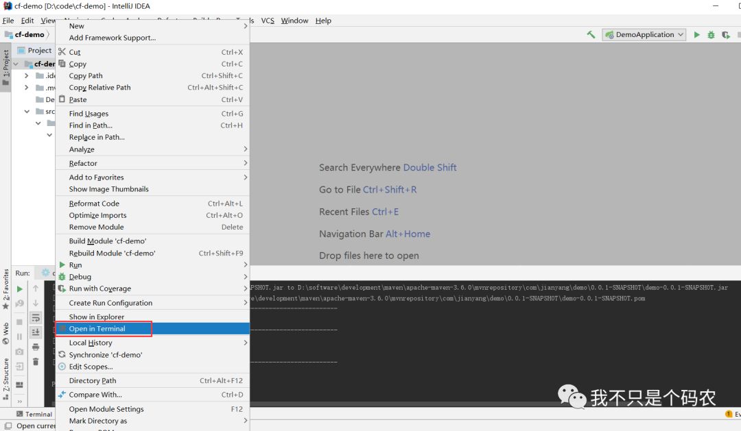 打包完成之后,现在我们在该项目工程folder目录下打开cmd,将我们的应用push到云端。(假如使用的InteliJ IDEA,可在工程上右键选择打开Terminal)