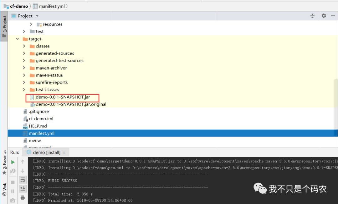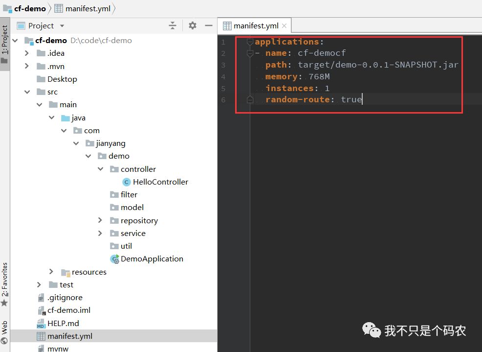 添加manifest.yml文件在工程子目录。manifest文件用来描述部署在PCF上应用的配置信息。
