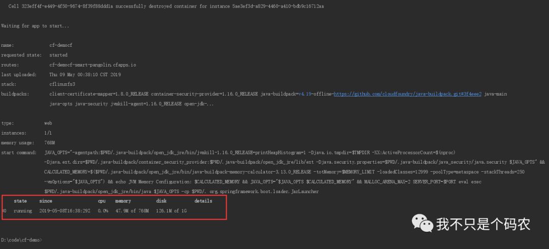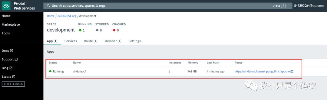 打开PWS管理界面,查看APP状态。可以看到咱们push的APP正在运行中。