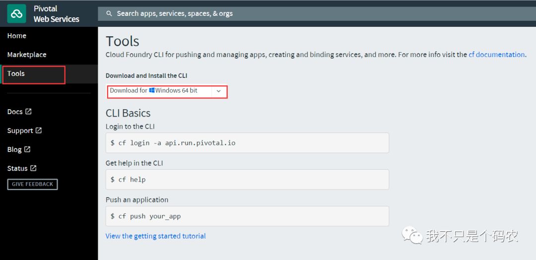 CF CLI(Cloud Foundry Command Line Interface)是PCF的终端管理工具,我们部署应用,执行命令由此提供。可在PWS管理界面Tools下载,如下:
