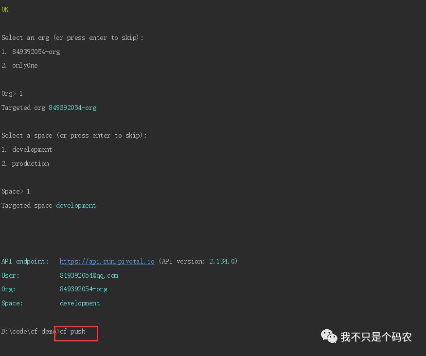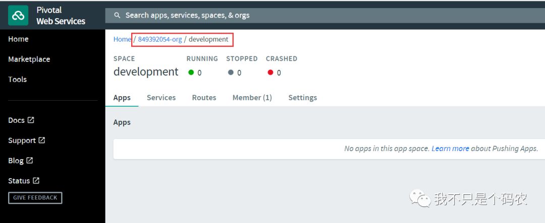 Orgs指的是组织,space一般分为dev、sit、uat、prod,我们部署的应用就在space层级下,因此我们要部署应用,需要选择组织,再选择部署的space。可以看到,在development层级下并没有任何应用部署。