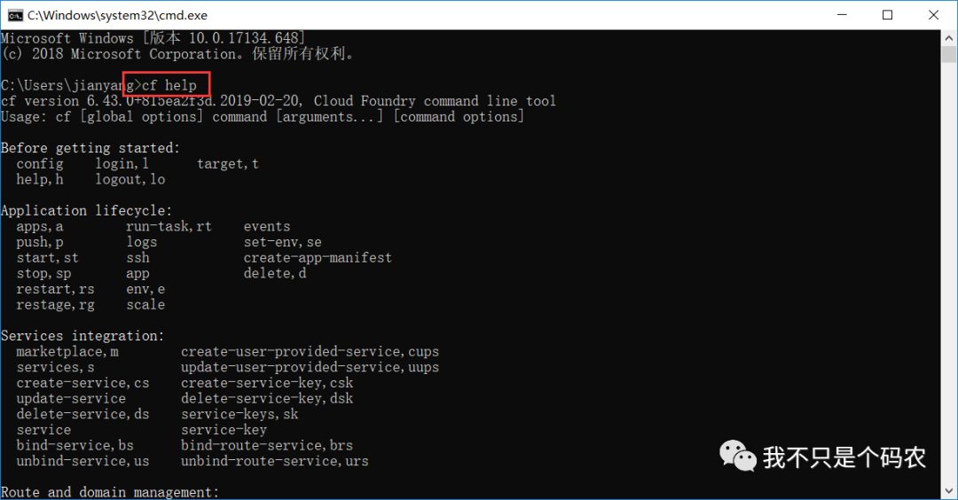 安装完成之后,打开cmd,执行命令cf help可检查是否安装正确。