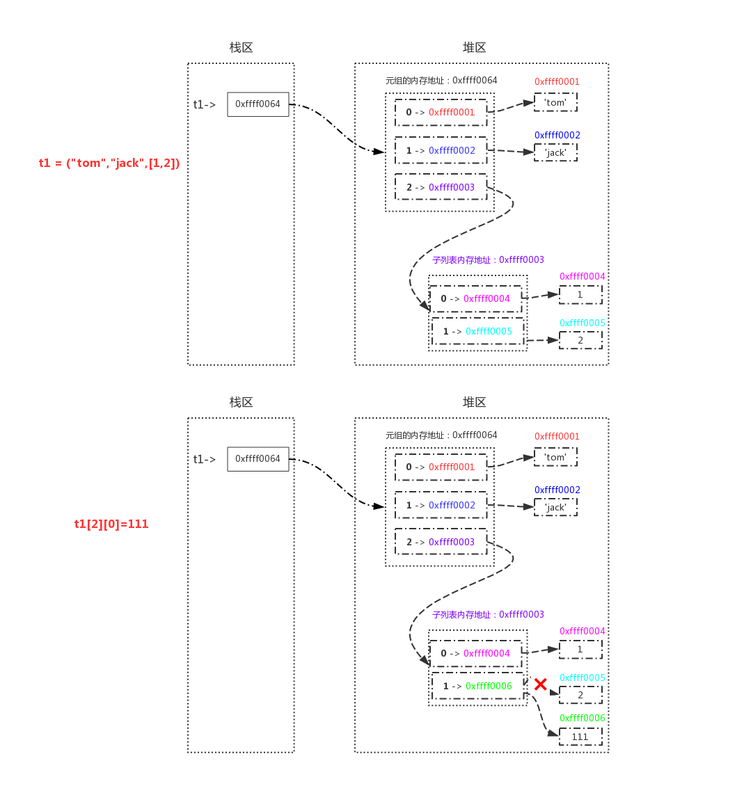 >>> t1[2][0]=111 # 如果元组中存在可变类型,是可以修改,但是修改后的内存地址不变