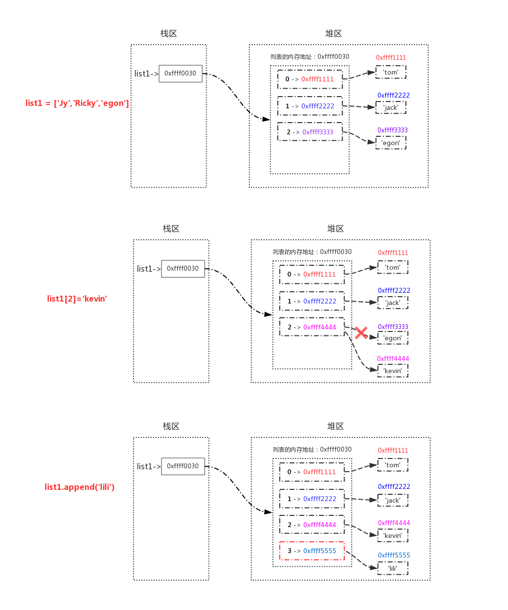 # 对列表的值进行操作时,值改变但内存地址不变,所以列表是可变数据类型