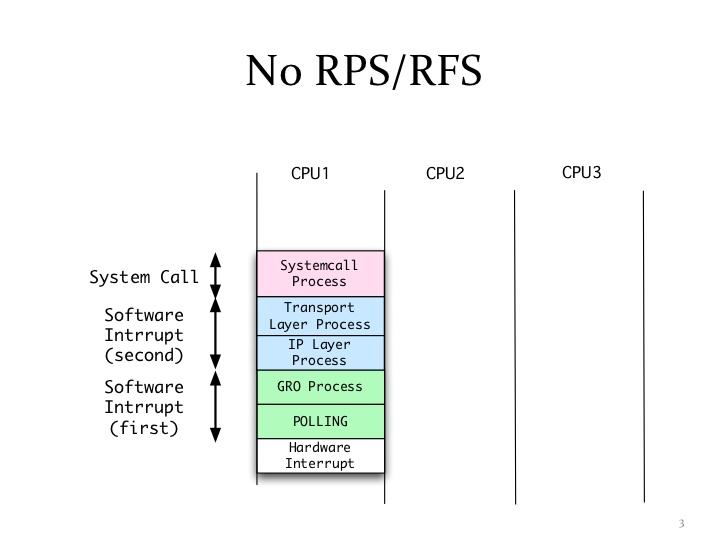 - 上面的提到的是多队列网卡的情况,在单队列网卡的情况下,RPS/RFS相当于在系统层用软件模拟了多队列的情况,以便达到CPU的均衡。