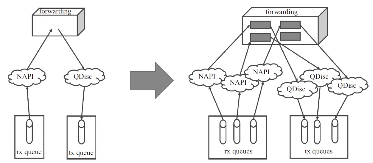 可以看出不同的核,操作的是不同的队列,从而避免了多个线程同时访问一个队列带来的锁的开销。但是,如果逻辑核的数目大于每个接口上所含的发送队列的数目,那么就需要有机制将队列分配给这些核。不论采用何种策略,都需要引入锁来保护这些队列的数据。
