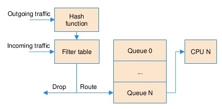 网卡是如何将网络中的报文分发到不同的队列呢?常用的方法有微软提出的RSS与英特尔提出的Flow Director技术,前者是根据哈希值希望均匀地将包分发到多个队列中。后者是基于查找的精确匹配,将包分发到指定的队列中。此外,网卡还可以根据优先级分配队列提供对QoS的支持。