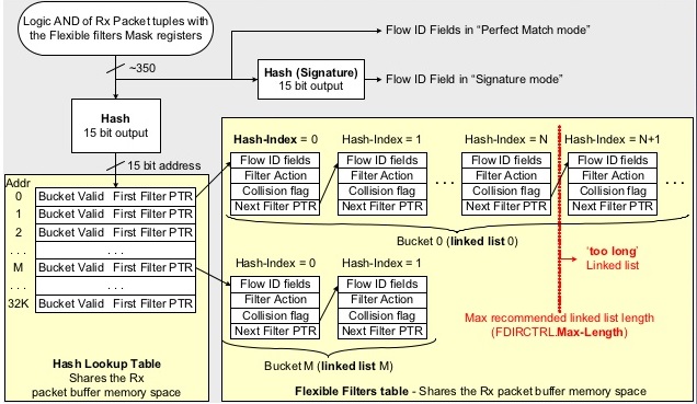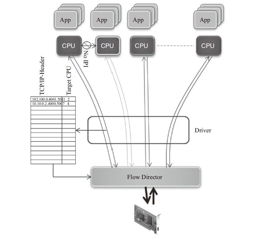 Flow Director技术是Intel公司提出的根据包的字段精确匹配,将其分配到某个特定队列的技术:网卡上存储了一个Flow Director的表,表的大小受硬件资源限制,它记录了需要匹配字段的关键字及匹配后的动作;驱动负责操作这张表,包括初始化、增加表项、删除表项;网卡从线上收到数据包后根据关键字查Flow Director的这张表,匹配后按照表项中的动作处理,可以是分配队列、丢弃等。