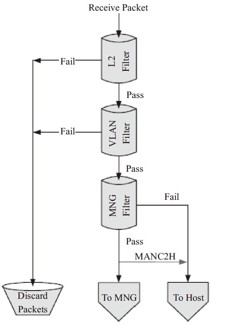 来自外部的数据包哪些是本地的、可以被接收的,哪些是不可以被接收的?可以被接收的数据包会被网卡送到主机或者网卡内置的管理控制器,其过滤主要集中在以太网的二层功能,包括VLAN及MAC过滤。