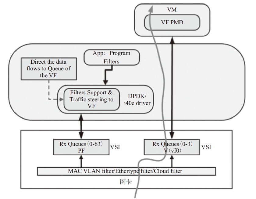 针对IntelXL710网卡,PF使用i40e Linux Kernel驱动,VF使用DPDK i40e PMD驱动。使用Linux的Ethtool工具,可以完成配置操作cloud filter,将大量的数据包直接分配到VF的队列中,交由运行在VF上的虚机应用来直接处理。