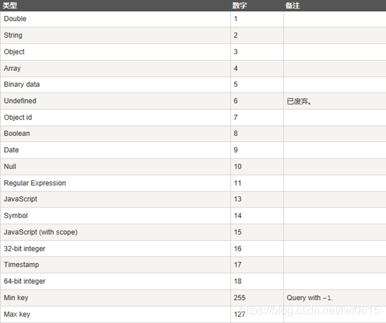 | Min/Max keys | 将一个值与 BSON(二进制的 JSON)元素的最低值和最高值相对比。 |