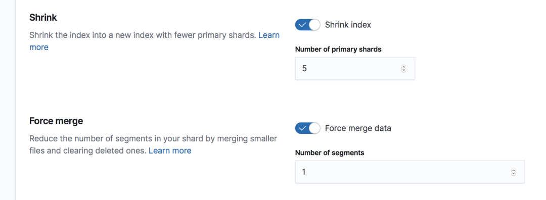 同时,也在 warm phase 阶段,设置索引 shrink,把索引的分片数缩成 5 个,因为老的索引已经不执行写入了,所以也可以执行 force merge, 强制把 segment 文件合并为 1 个,可以获得更好的查询性能。