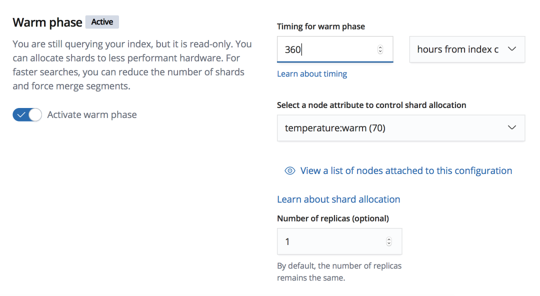 在 warm phase, 把创建时间超过 360 小时的索引从 hot 节点迁移到 warm 节点上,保持索引的副本数量为 1。之所以使用 360 小时作为条件,而不是 15 天作为条件,是因为客户的索引是按小时创建的,如果以 15 天作为迁移条件,则在每天凌晨都会同时触发 15 天前的 24 个索引一共 24*120=2880 个分片同时开始迁移索引,容易引发前文介绍的由于迁移分片数量过多导致创建索引被阻塞的问题。所以以 360 小时作为条件,则在每个小时只会执行一个索引的迁移,这样把 24 个索引的迁移任务打平,避免其它任务被阻塞的情况发生。