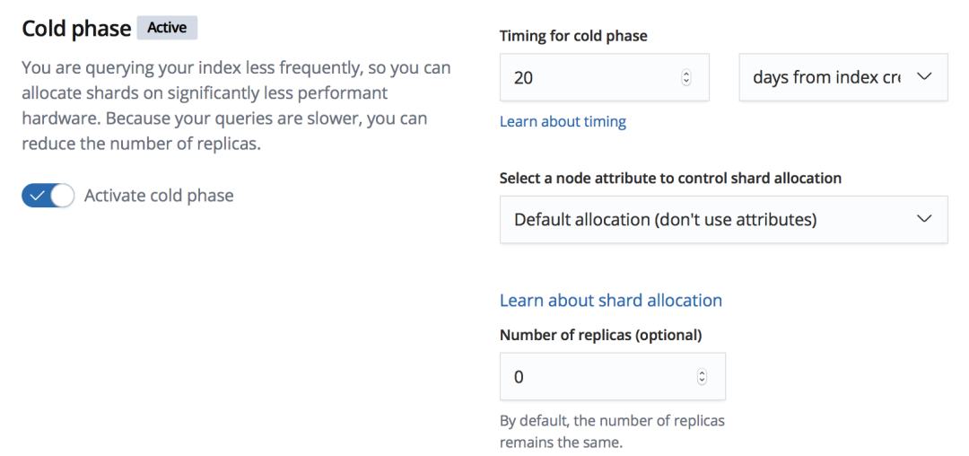 此处的 timing 是创建时间 20 天后,需要保证在第二步骤中,对过去老索引数据备份先执行完成后才可以进入到 cold phase.