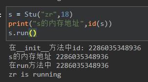 可以看出,在__init__函数,还是run函数,还是Stu实例化后的s,self在内存中的id都是相同的。