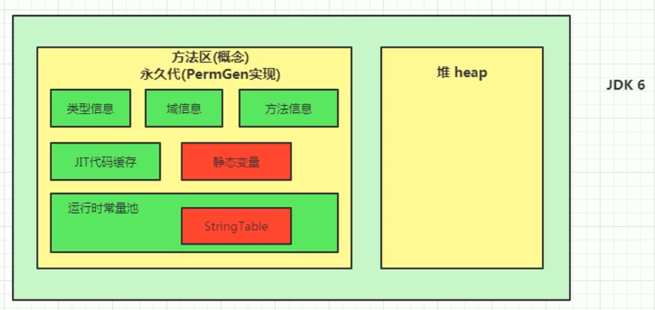 | JDK6及以前 | 有永久代,字符串常量池、静态变量都存放在永久代上 |
