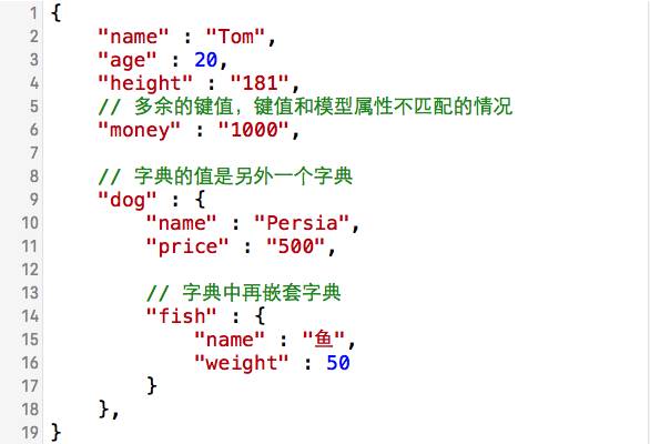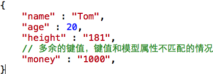 不对应有两种,一种是字典的键值大于模型属性数量,这时候我们不需要任何处理,因为runtime是先遍历模型所有属性,再去字典中根据属性名找对应值进行赋值,多余的键值对也当然不会去看了;另外一种是模型属性数量大于字典的键值对,这时候由于属性没有对应值会被赋值为nil,就会导致crash,我们只需加一个判断即可,JSON数据和sample如下: