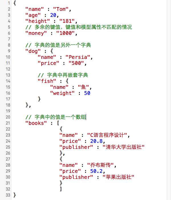 第三种情况是模型的属性是一个数组,数组中是一个个模型对象,例如下面的数据我就可以通过books[0].name获取到C语言程序设计