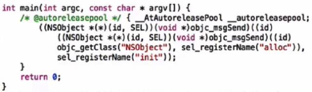 删除掉一些强制转换语句,可以看到调用方法本质就是发消息,[[NSObject alloc]init]语句发了两次消息,第一次发了alloc 消息,第二次发送init 消息。利用这个功能我们可以探究底层,比如block的实现原理。