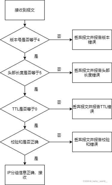 ① 检查接收到的 IPv4 分组头部的字段,包括版本号(Version)、头部长度(IP Head length)、生存时间(Time to live)以及头校验和(Header checksum)字段。对于出错的分组调用 ip_DiscardPkt( )丢弃,并说明错误类型。