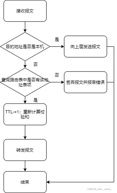 - 实现 IPv4 分组的基本接收处理功能对于接收到的 IPv4 分组,检查目的地址是否为本地地址,并检查 IPv4 分组头部中其它字段的合法性。提交正确的分组给上层协议继续处理,丢弃错误的分组并说明错误类型。