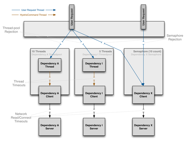 随着服务的拆分,各个服务有着明确的职责,服务之间通过轻量级的协议进行通讯。但有时候我们完成一个功能需要同时调用多个微服务,比如完成订单的创建,那么获取用户信息需要调用用户微服务,获取商品信息需要调用商品微服务,给用户增加积分需要调用积分微服务。假如用户微服务调用此时响应慢,就会导致调用线程(tomcat线程或jetty线程等)被占用,降低系统的处理能力。如果用户微服务被隔离了,使用是自己的线程,那么就不会占用调用线程,系统的处理能力就会提高。 下面是官网隔离的图。