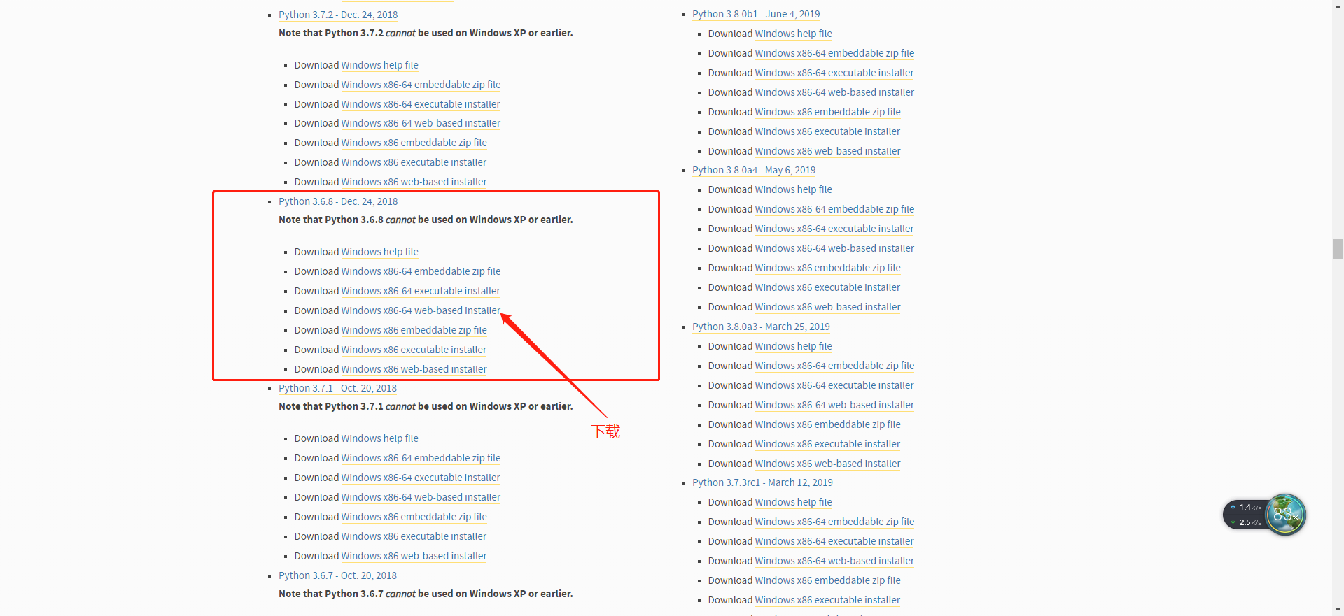 python的下载地址: (不推荐使用最新版) 下载地址:https://www.python.org/downloads/windows/对应版本:Python 3.6.8 - Dec. 24, 2 ...