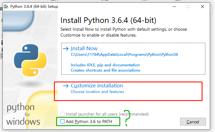 1.勾选Add Python 3.6 to PATH,会把Python的安装路径添加到系统环境变量的Path变量中;