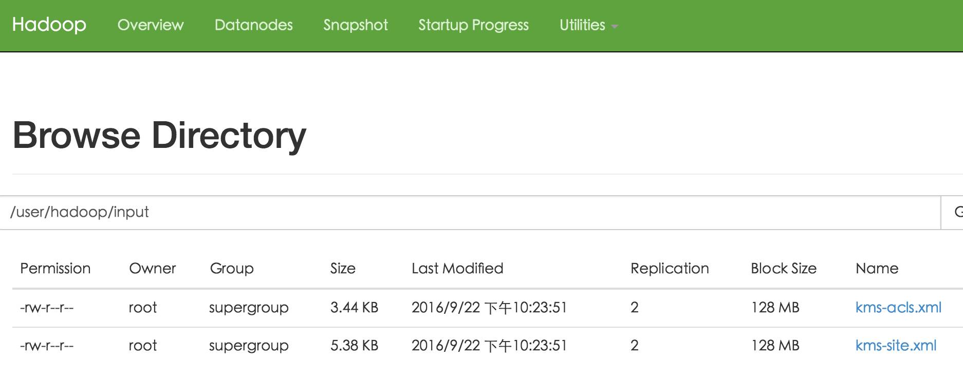 $ hdfs dfs -put /home/hadoop/etc/hadoop/kms*.xml /user/hadoop/input