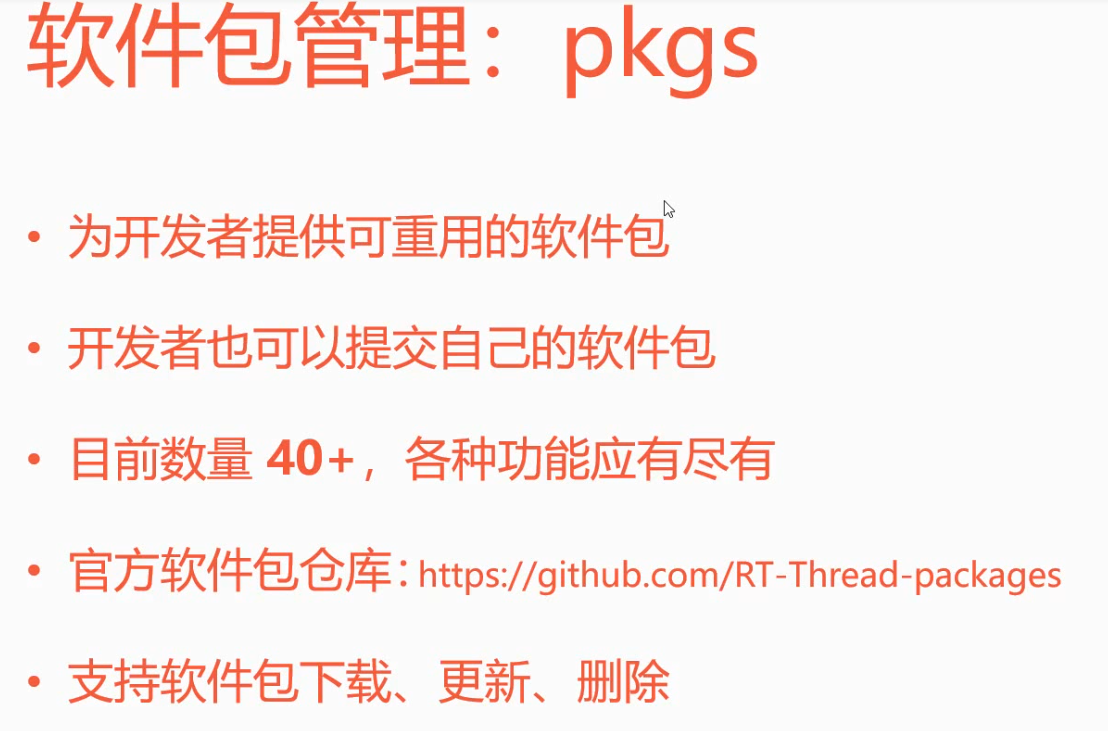 1、rt-thread软件包管理功能,我们先来了解下软件包的功能定义,软件包是运行rt-thread操作系统平台之上,面向不同应用领域的软件,形成一个个通用性强的软件组件,并由软件包描述信息、文档、示例、软件包源代码或库文件组成,软件包管理功能是rt-thread3.0发布时的重要功能,目前rtthread提供了一个软件包的管理平台,这个平台非常的开放,里面存放了官方提供的,或者rt-thread开发者提供的各种软件包,为我们开发者提供了众多可重用的软件包的选择,这也是rt-thread重要的生态组成部分,