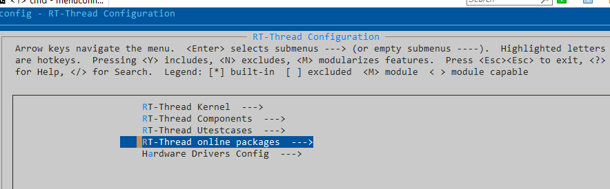 4、接下来我们体验一下,还是在rt-thread源码下的stm32f429下的bsp下,右键打开env,输入menconfig,找到rt-thread online packages,进去后就是rt-thread全部软件包的汇总