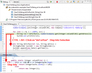 第二个是“Step into Selection”. 这也是很简单,但很多人使用的一个。要使用它,你只需要按 Ctrl+Alt 同时点击一个你想运行到的方法名。非常方便,非常快速。相比“Step Into”这个非常方便,想想你像跟踪进一个有很多参数的函数,如果用“Step Into”你必须进入,退出每个参数计算过程,才能进入到你真正想进的函数。“Run toline”也是很棒的特性。只需要把光标放在你想运行到的哪一行前面,然后按“CTRL+R”就可以了。