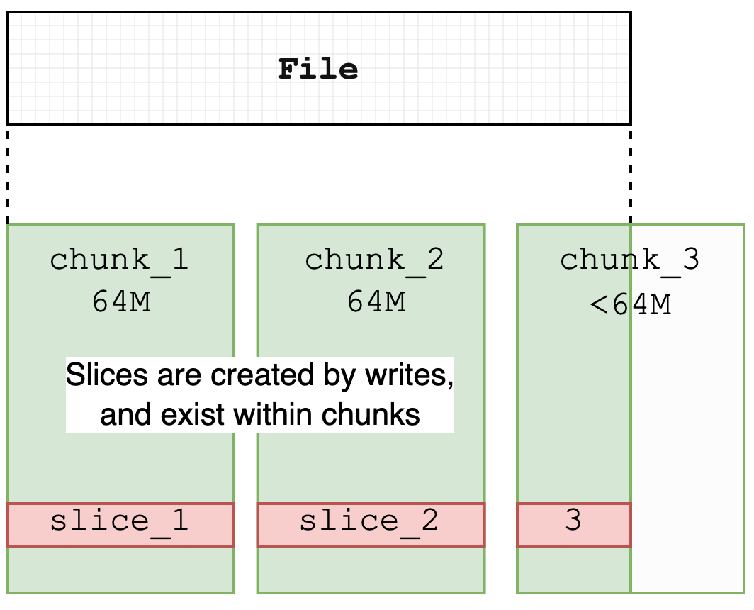 JuiceFS 中的 Slice 是在其他文件系统中不常见的一个结构。主要功能是记录文件的写入操作,并在对象存储中进行持久化。对象存储不支持原地文件修改,因此,JuiceFS 通过引入 Slice 结构允许更新文件内容,而无需重写整个文件。这与 Journal File System 有些类似,其中写入操作仅创建新对象,而不是覆盖现有对象。修改文件时,系统会创建新的 Slice,并在该 Slice 上传完毕后更新元数据,从而将文件内容指向新的 Slice。被覆盖的 Slice 内容随后通过异步压缩过程从对象存储中删除,导致在某些时刻对象存储的使用量会暂时超过文件系统实际使用量。