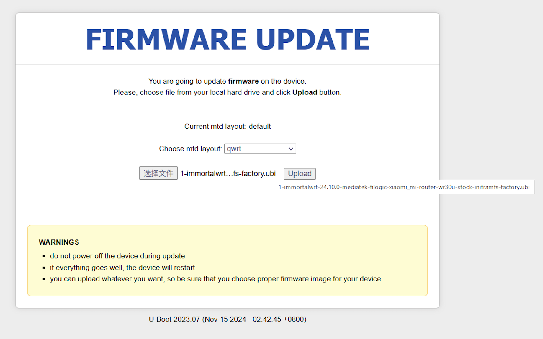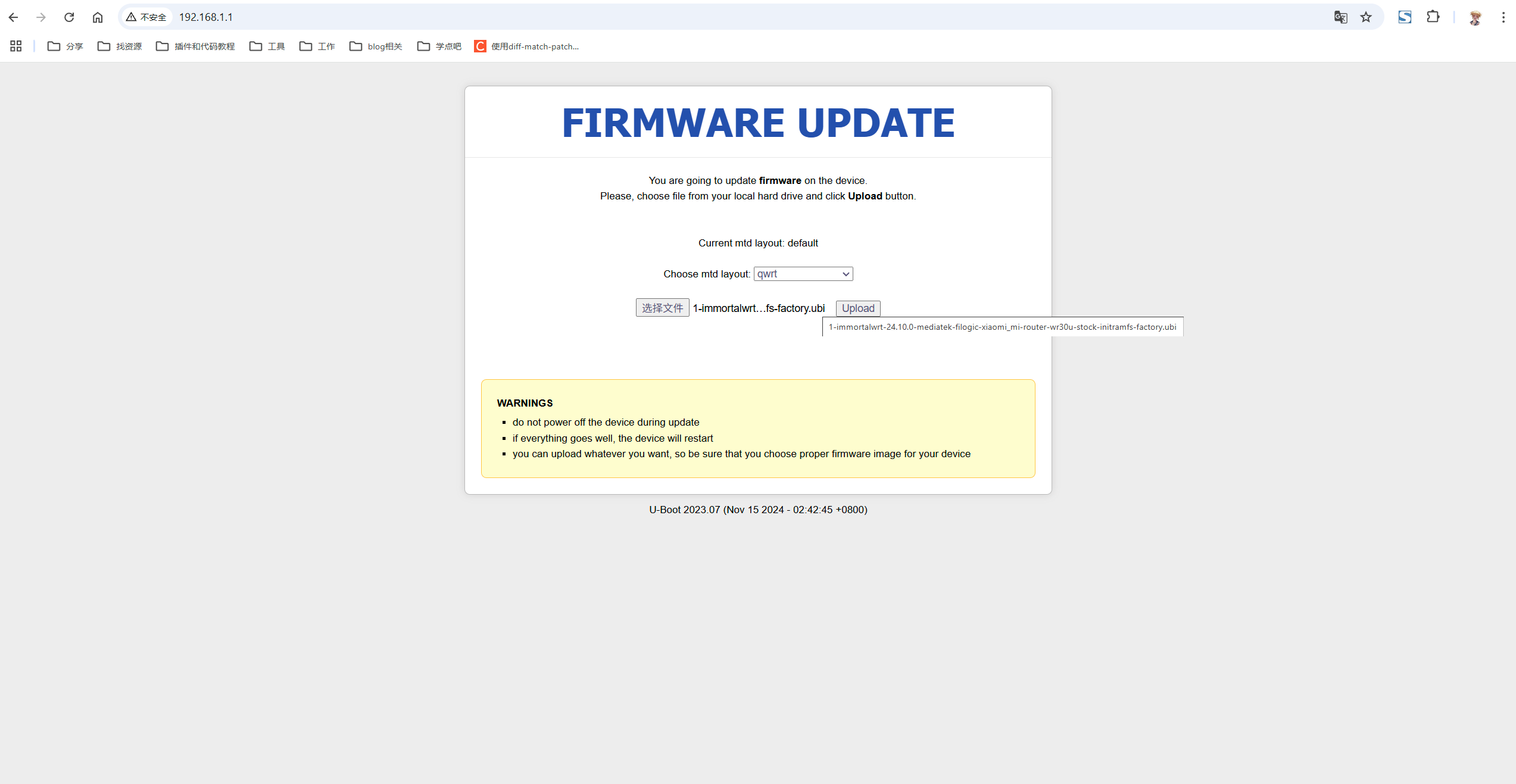 若你已经是hanwckf的uboot了,更新或刷新版的 immortalwrt 可能会失败。