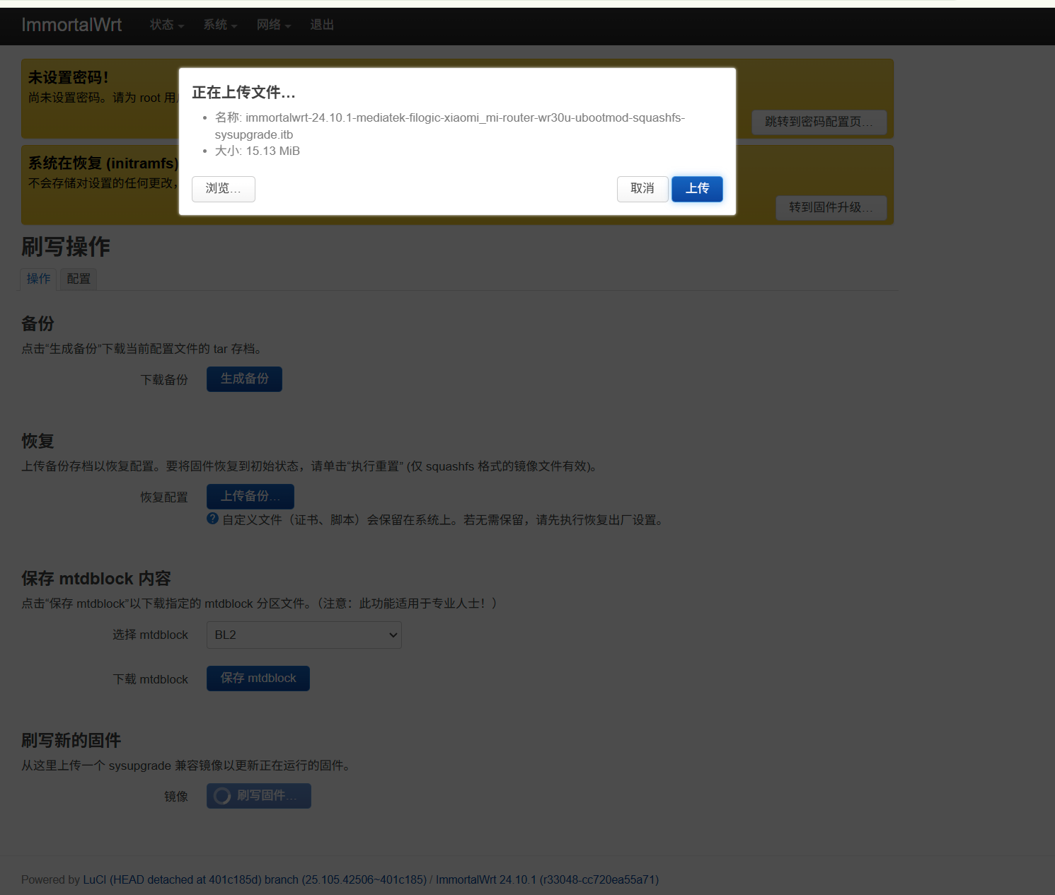 提示:如果不刷入这个文件或者刷错了这个,进入路由器后台会提示 “系统在恢复 (initramfs) 模式下运行”。