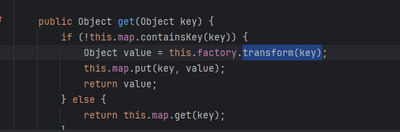 但在LazyMap的get方法中,我们看到它的transform(key);这里传入一个key参数
