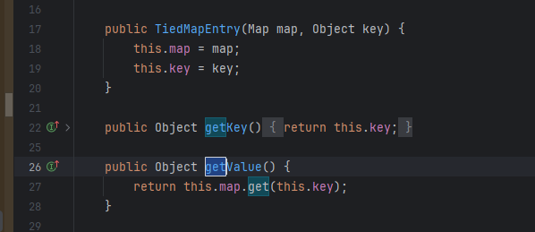 如何传入key呢;在整条链子中我们可以知道;TiedMapEntry类的构造函数中可以传入key,并且调用getvalue时,这个key作为get函数的参数,因此我们只需要在TiedMapEntry对象传入恶意字节码类即可