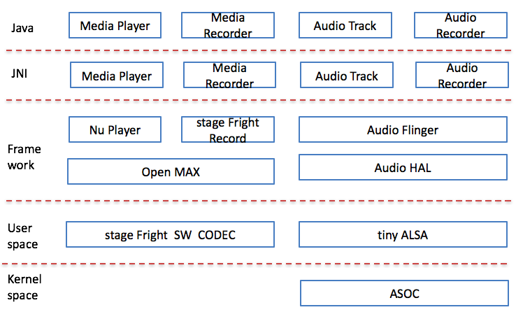 Android音频软件分不同的层,主要有kernel/user/Framework/JNI/Java。从底层kernel向上讲吧。Android的核用的是Linux的。Linux上音频相关的子系统叫ALSA,包括kernel space和user space两部分。Kernel space里是音频驱动,user space里主要是提供API给应用程序调用。Android的音频驱动跟Linux是一样的,在user space里对ALSA进行了裁剪形成了tinyalsa。关于这些我在前面的文章( 音频的采集和播放)里简单描述过,有兴趣可以去看看。同时user space里还有音频软件编解码的各种库,包括音乐的(MP3/AAC等)和语音的(AMR-NB/AMR-WB等)。再向上就是Framework,里面模块众多,主要有NuPlayer/stageFright Record/openMAX/AudioFlinger等,网上讲audio Framework的文章太多了,这里就不细讲了。Auido HAL(Hardware Adapter Layer,硬件适配层)也在这一层。Framework上层是JNI(Java Native Interface),提供接口供Java调用,提供的接口主要有MediaRecorder/MediaPlayer/AudioTrack/AudioRecorder。最上层是Java层,也就是各种带有音频功能的APP(调用提供的API)了。