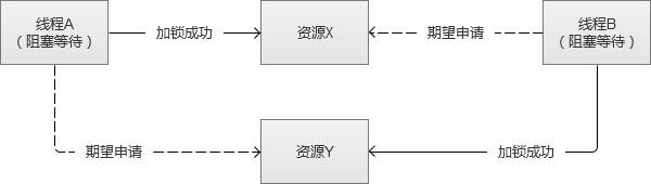 死锁现象(两个线程彼此锁住对方想要获取的资源,相互阻塞等待,永远无法达不到满足条件):