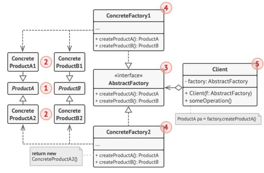 客户端代码使用抽象接口与工厂和产品进行交互,同样的代码能与依赖于不同工厂对象类型的多种产品变体进行交互。