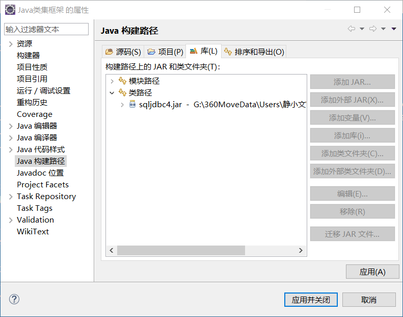先选中项目–右键鼠标–构建路径–配置构建路径–java构建路径–库–类路径–添加外部jar–选择那个包