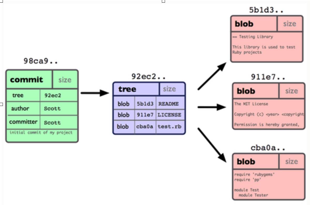 假如我们提交三个文件,git会用blob对象存储每个文件的快照。而在提交的同时,会创建一个提交对象,该提交对象包含一个指向文件快照的指针、包含一个或者0个指向该提交对象的父对象的指针、包含一些其他附属信息。那么单个提交对象在仓库中的数据结构如图: