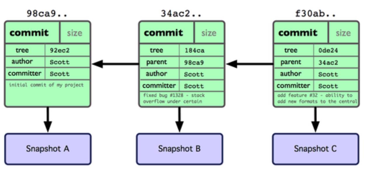 之后每做一次提交,都会有一个指向上一次提交对象的指针,连续提交三次之后如下图: